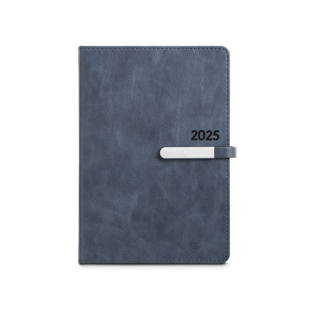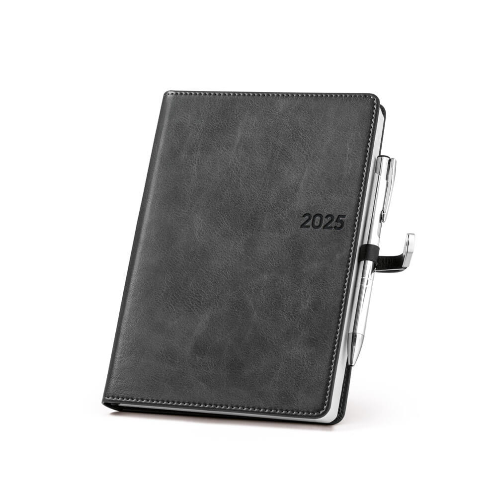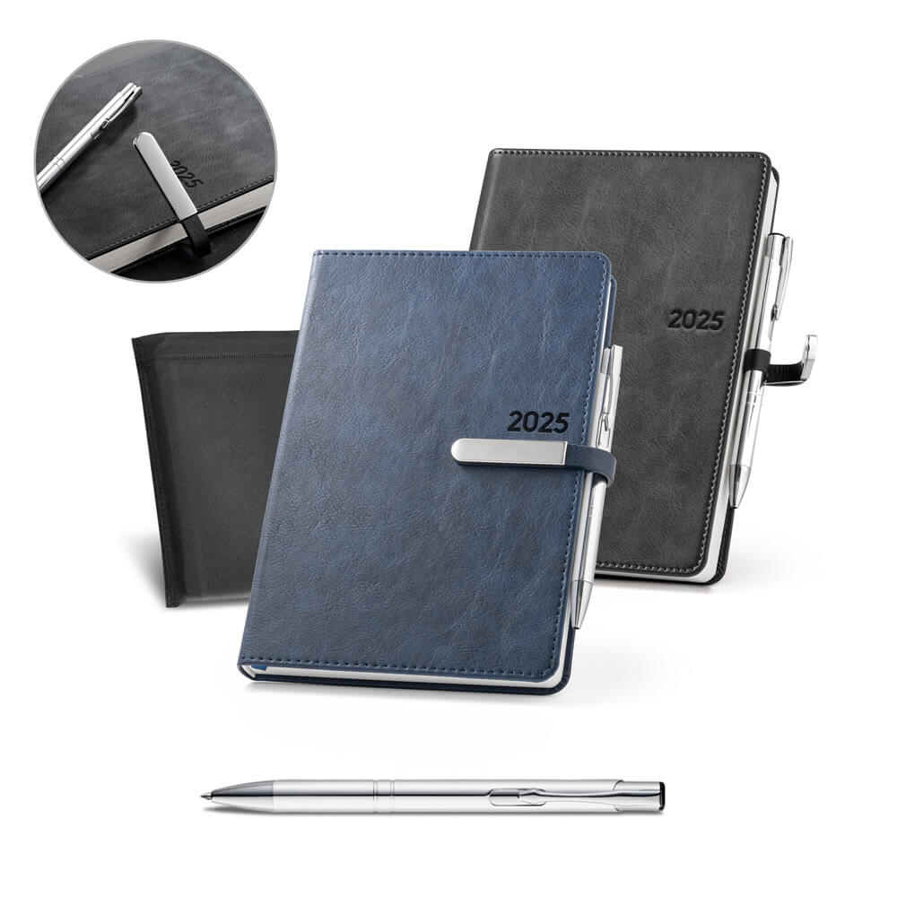 Descrição: Agenda A5 em PU e tecido em poliéster. Está organizada num plano diário. Possui fecho magnético, bolso frontal, suporte para esferográfica (inclusa) e marcador em fita. Fornecida com bolsa de non-woven. 148 x 210 mm | Bolsa: 205 x 250 mm