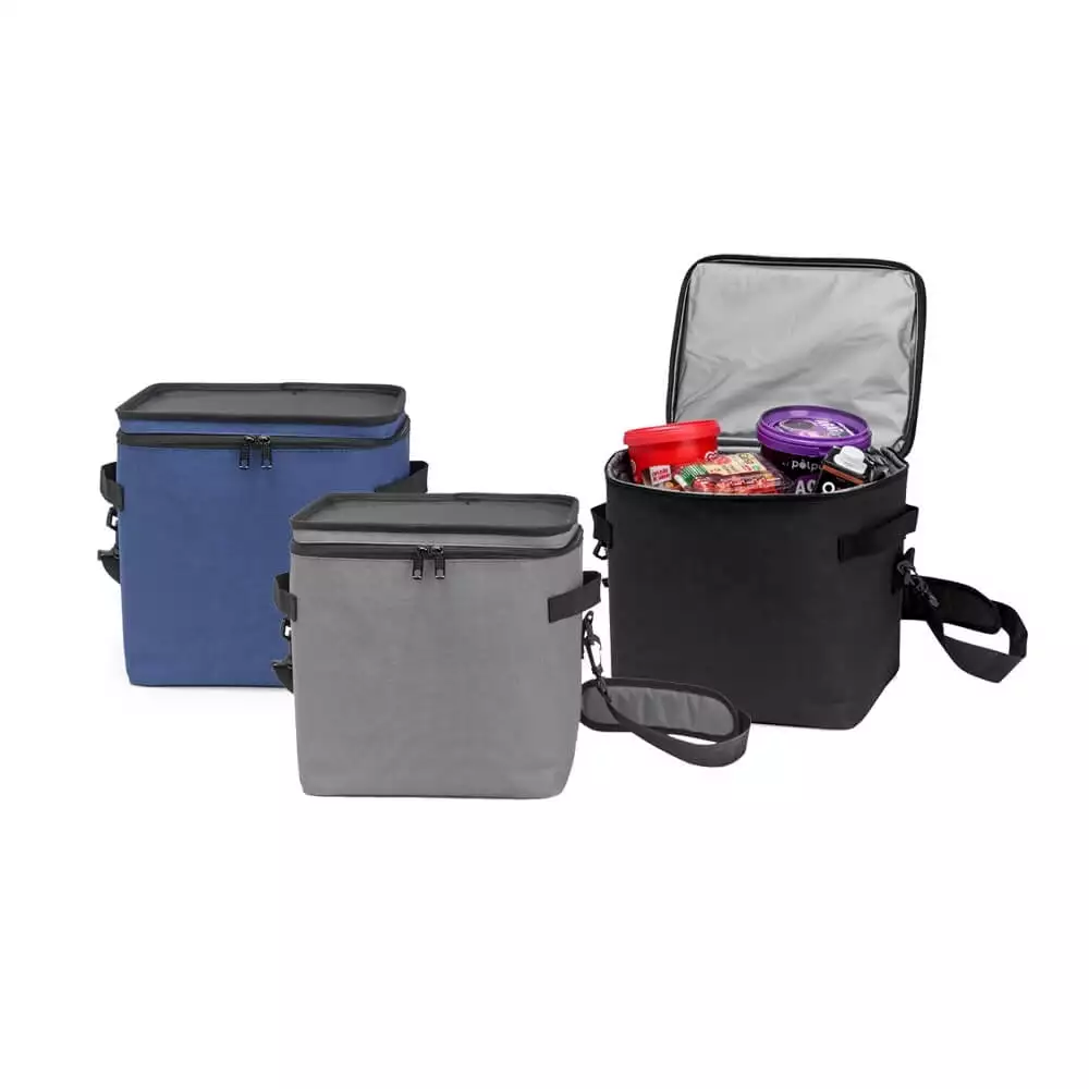 Bolsa térmica em 600D com zíper duplo, alça ajustável em webbing e bolso frontal.