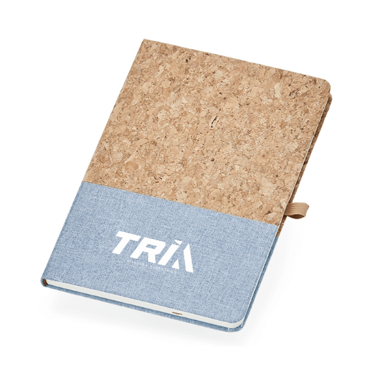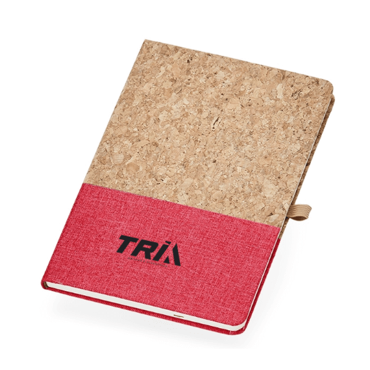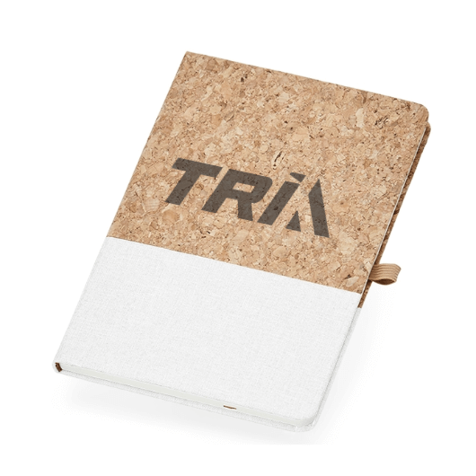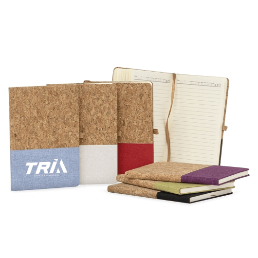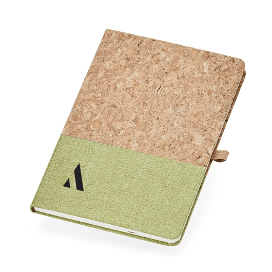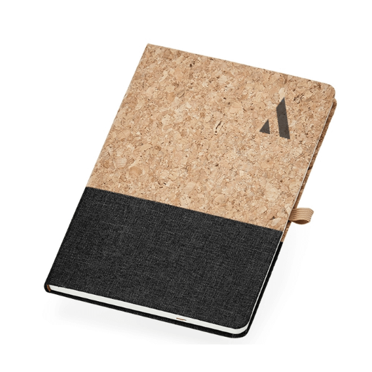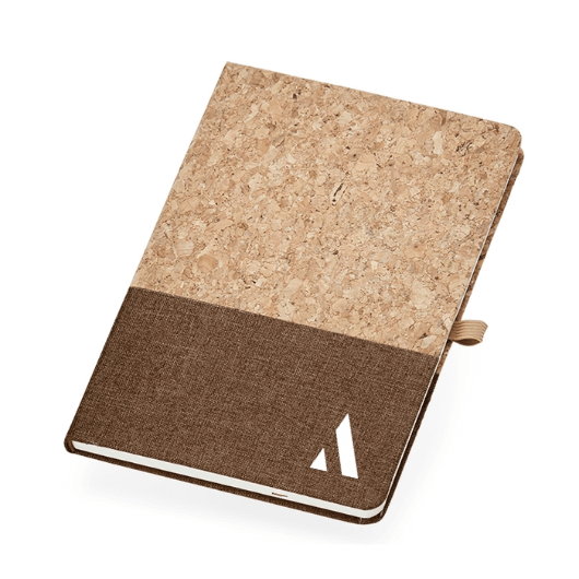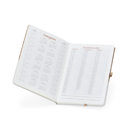 Descrição: Caderneta A5 de cortiça com detalhe em linho e suporte para caneta, contém marcador de página em cetim, página para dados pessoais, calendário, páginas de planejamento e aproximadamente 93 folhas marfim com pauta.