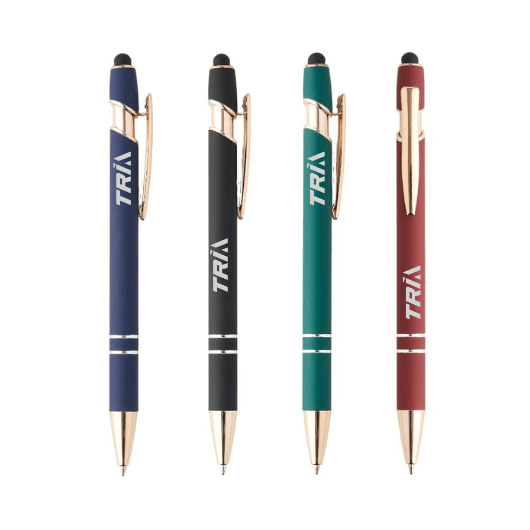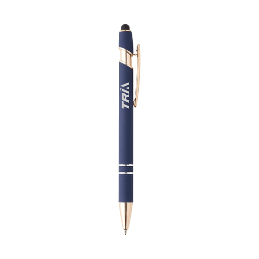 Descrição: Caneta metálica touchscreen com acabamento similar à borracha, acionamento por clique e carga esferográfica azul 1.0mm.