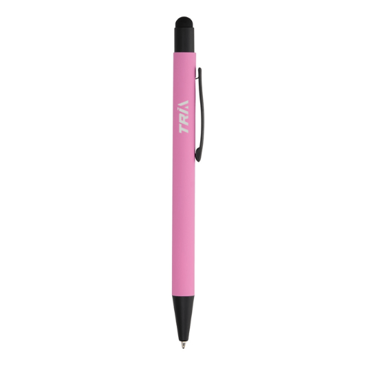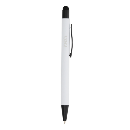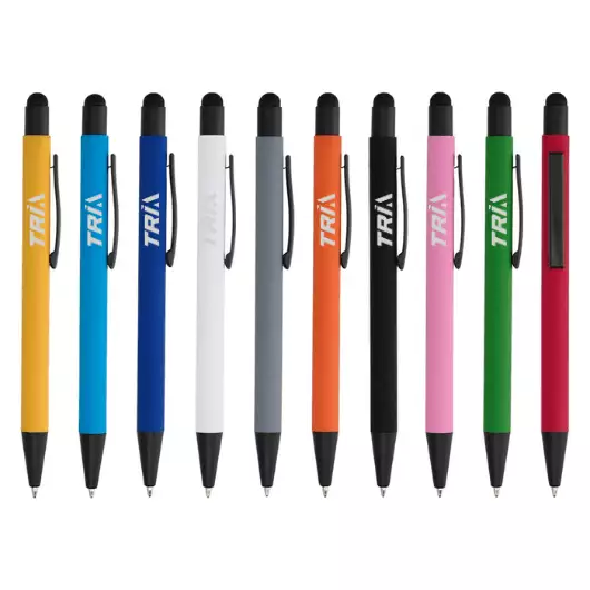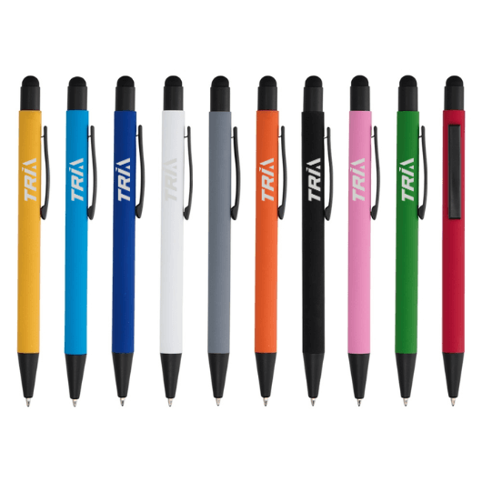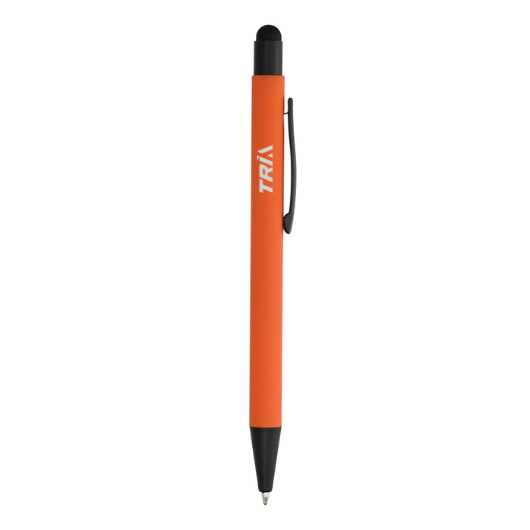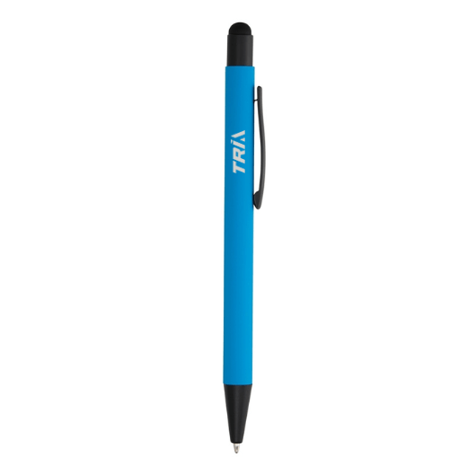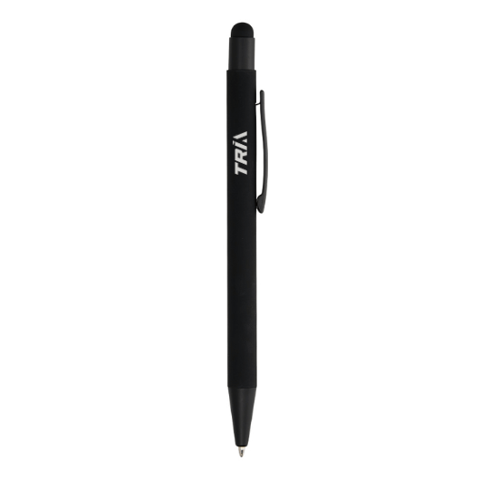 Descrição: Caneta metálica touchscreen com acabamento emborrachado, acionamento por clique e carga esferográfica azul 1.0mm.
