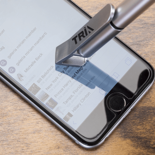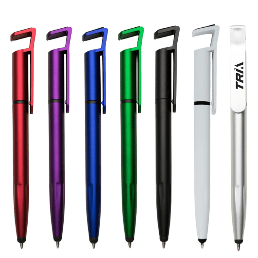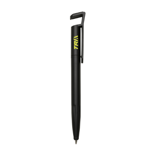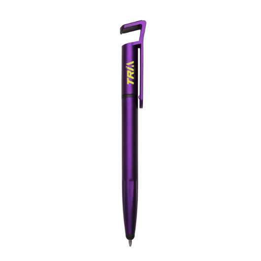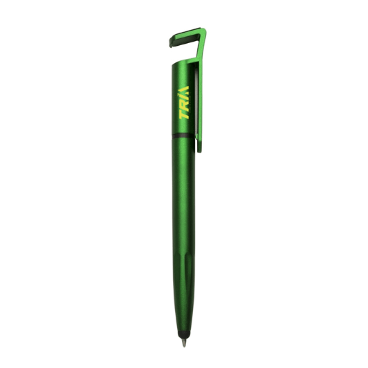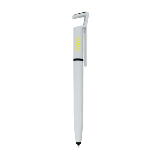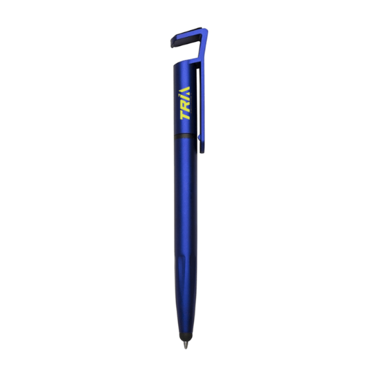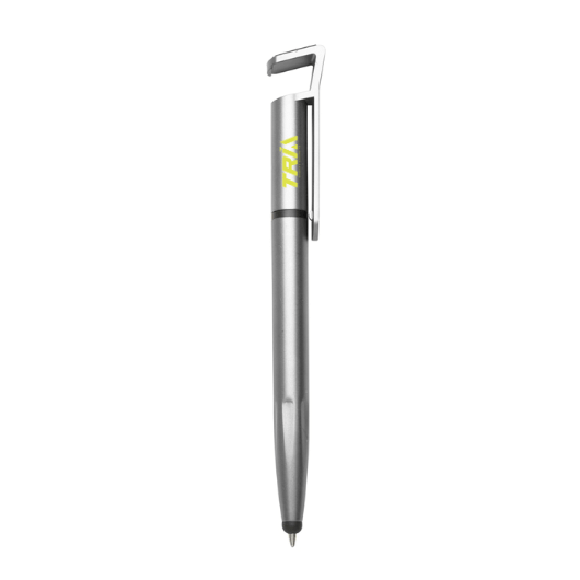 Descrição: Caneta plástica com suporte para celular, ponteira touch screen e limpador de tela. Carga esferográfica azul e acionamento por rotação.