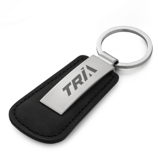 Descrição: Chaveiro de metal brilhante com detalhe de couro sintético, frente lisa e verso com um parafuso.