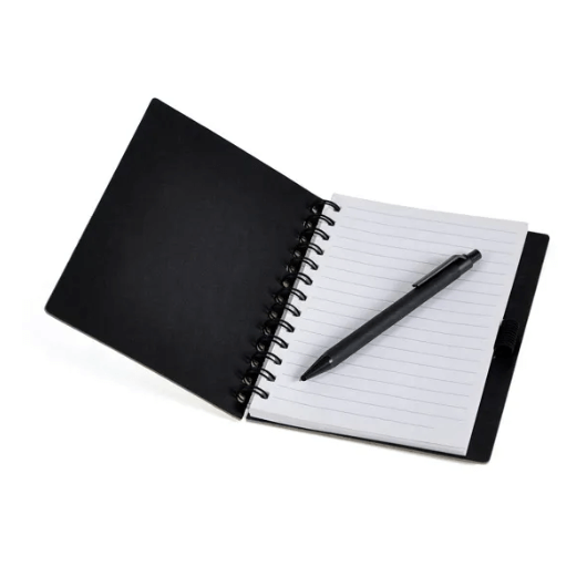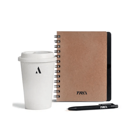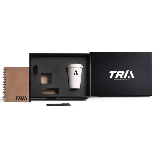 Descrição: Esse kit conta com caderno com 100 folhas brancas pautadas e espiral wire-o em metal cromado e copo em Fibra de Bambu / PP.