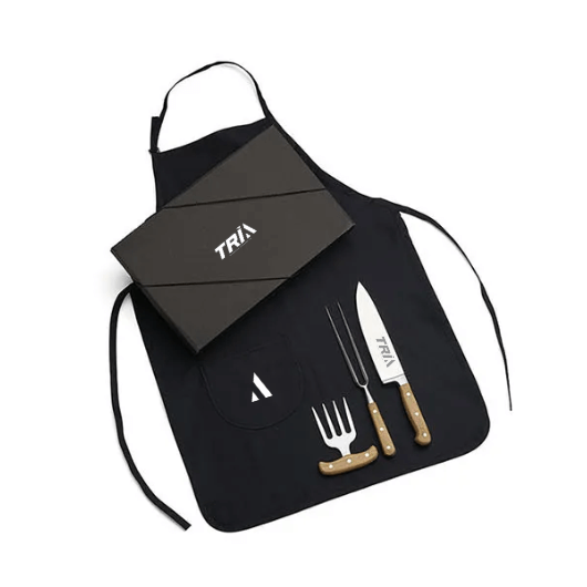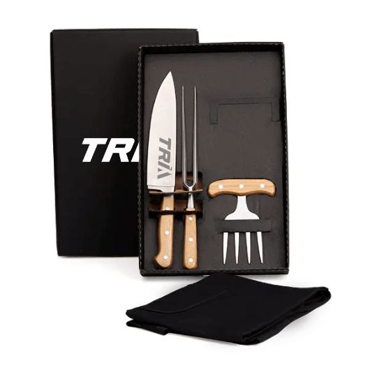 Descrição: Kit para churrasco. Conta com faca 8'', garfo 4 dentes e garfo trinchante em bambu/inox; Avental em brim. Faca e garfo trinchante em aço forjado AISI420.