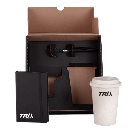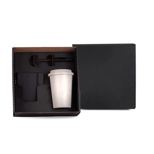 Descrição: Kit com copo, caneta e caderneta.