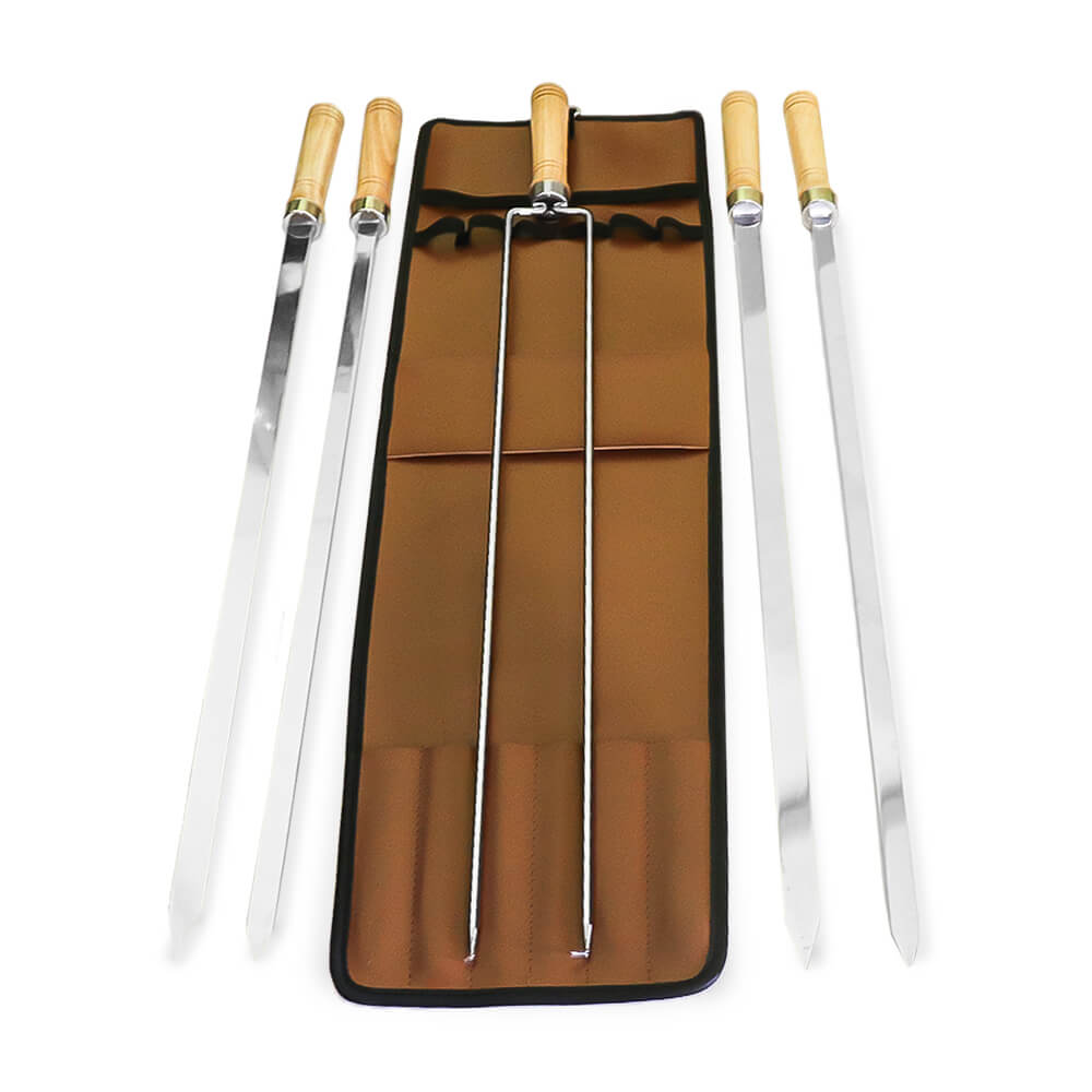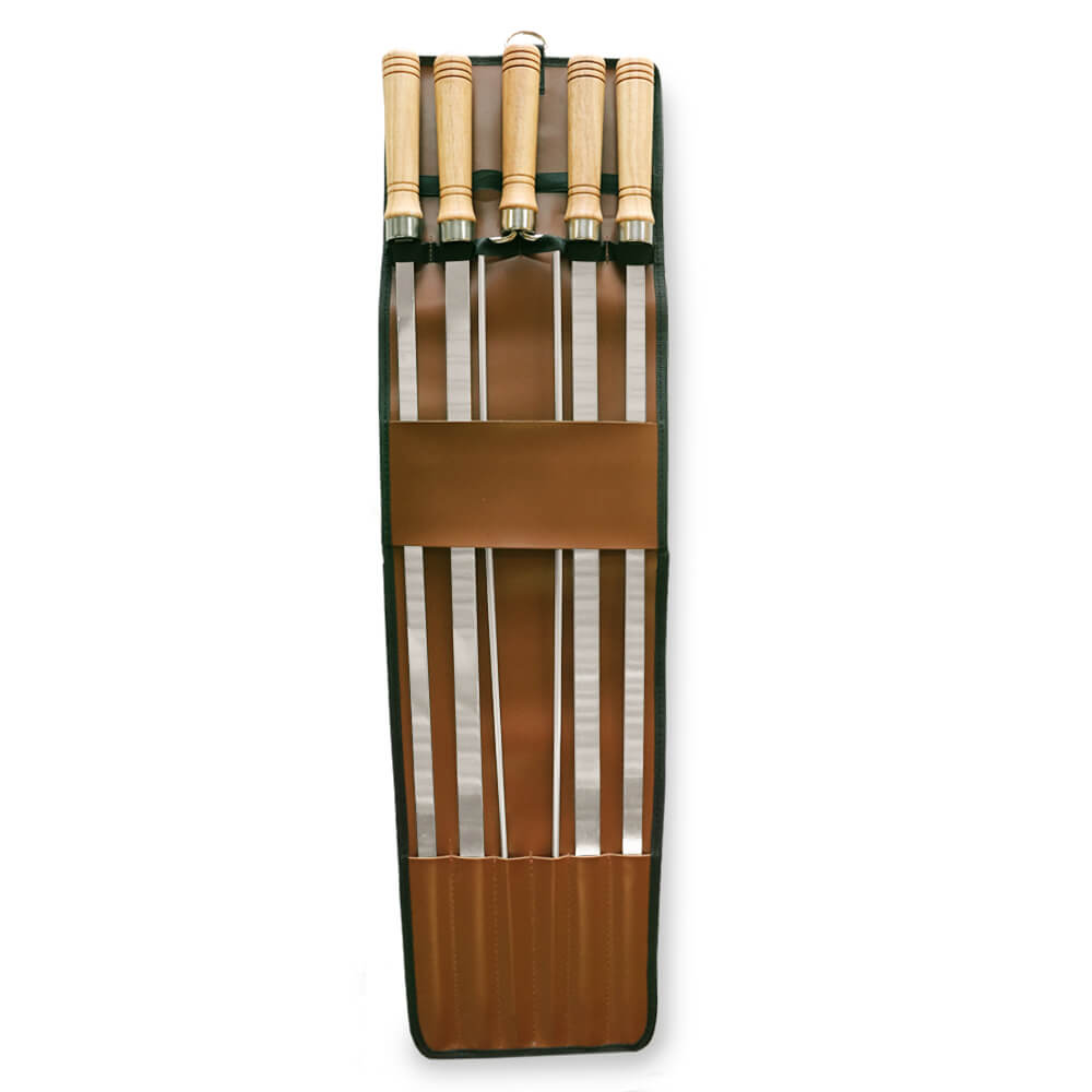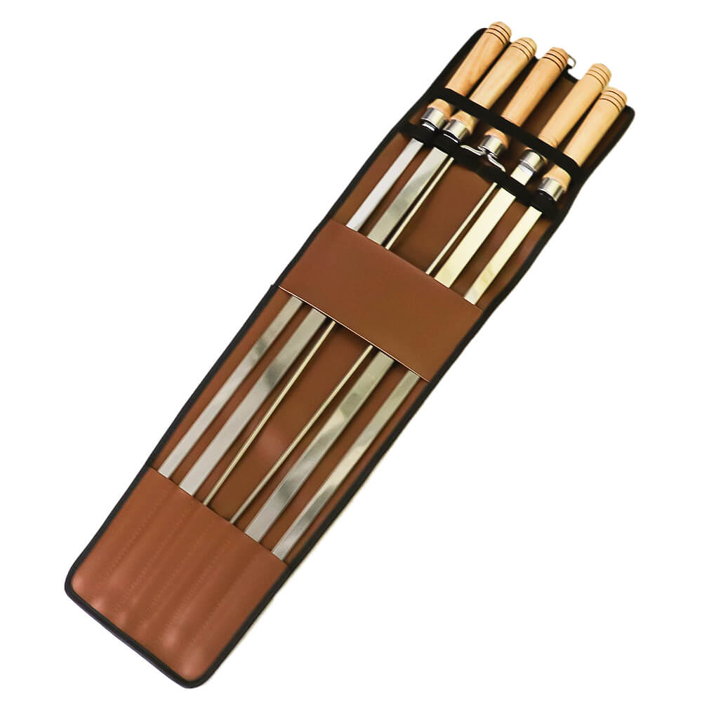 Kit com 5 espetos, dois largos de 10x4mm, dois estreitos de 7x4mm e um duplo de 6mm. Bolsa em couro sintético.