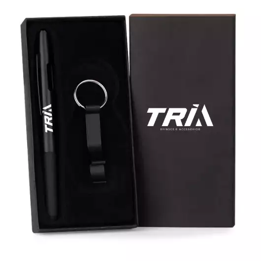 Kit composto por squeeze preto; caderno para anotações e caneta esferográfica em ABS preta.