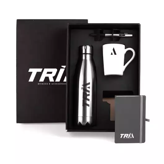 Conta com garrafa de 750 ml em aço inox na cor prata; caneca em cerâmica branca com capacidade de 230 ml; caderno para anotações cinza com capa dura e caneta esferográfica em ABS prata.