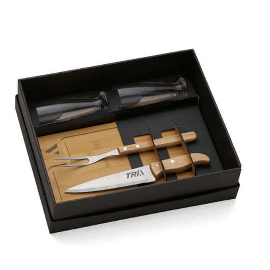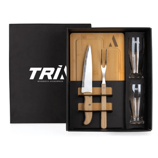 Descrição: Conta com tábua em Bambu; Faca e garfo em Inox/Madeira; 2 copos em vidro.