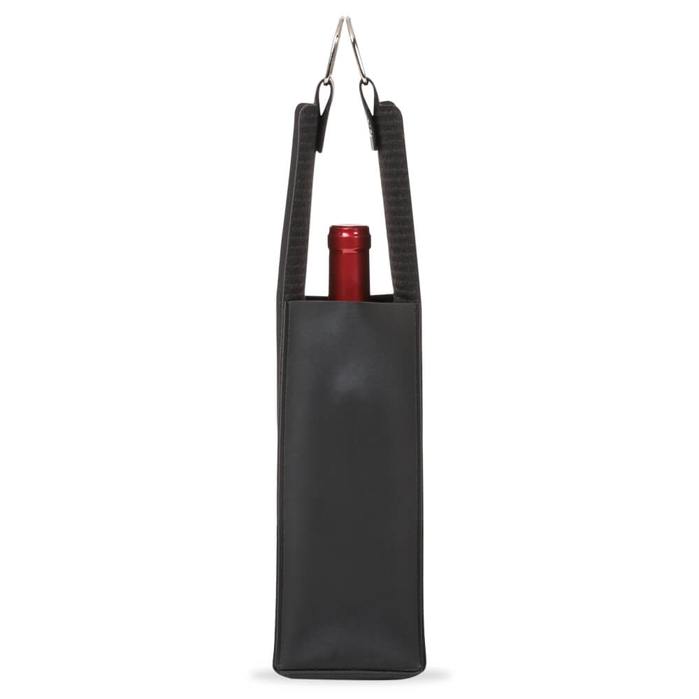 Descrição: Estojo porta vinho em couro sintético bidim, contém duas alças metálicas e botão para lacre.