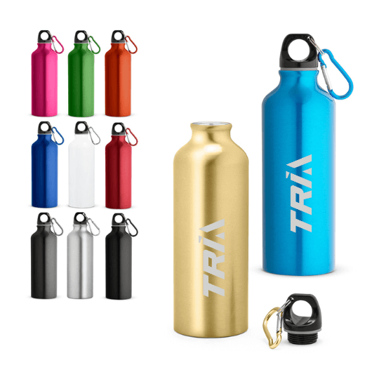 Descrição: Squeeze em alumínio com mosquetão e capacidade até 530 mL. Certificação EU Food Grade. Caixa branca 94656 vendida opcionalmente. 66 x 210 mm